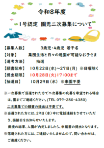令和8年度1号認定の園児について、下記の内容で二次募集させていただきます。