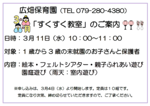 3月のすくすく教室を行いますので、ぜひ、ご参加ください。